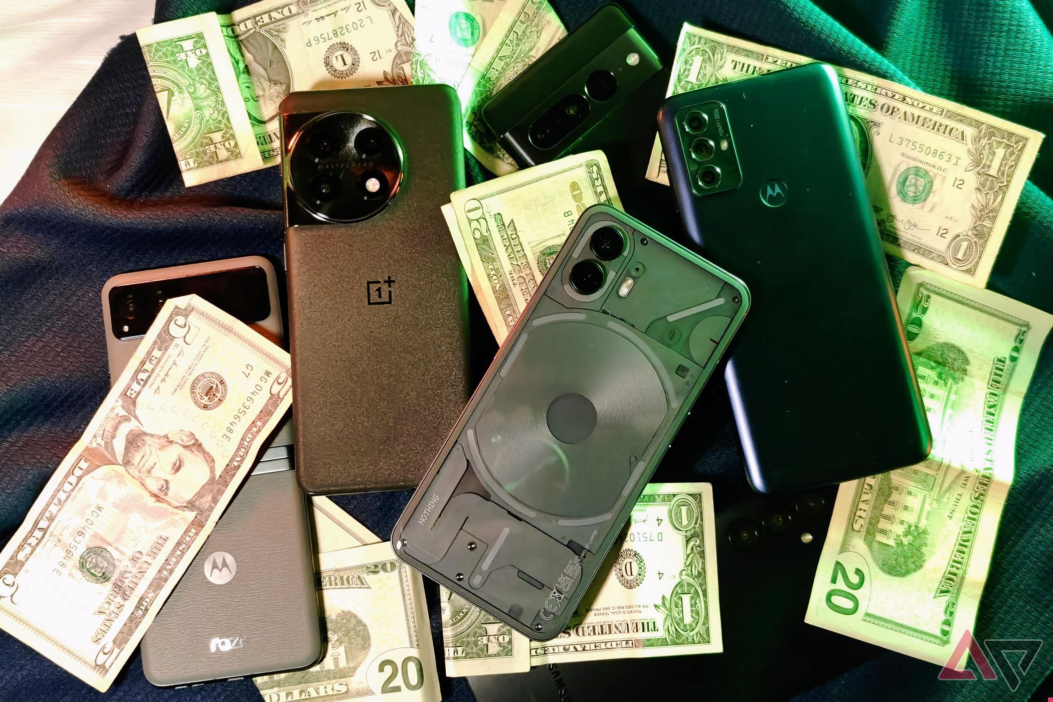 Nothing Phone 2, Pixel 7 Pro, Motorla Razr, OnePlus 11, and more smartphones on a table with cash